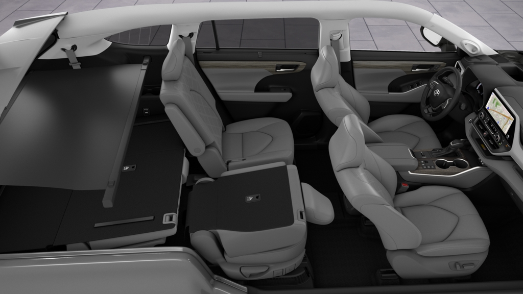 • 7-passenger seating with second-row fold-down captain's chairs and fold-down inboard armrests, adjustable headrests and two cup holders mounted on the floor; and 60/40 split, fold-flat third-row seats with sliding headrests and recline function.